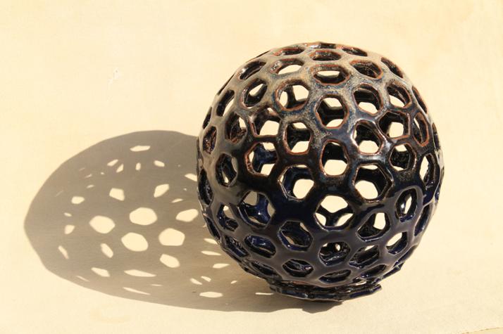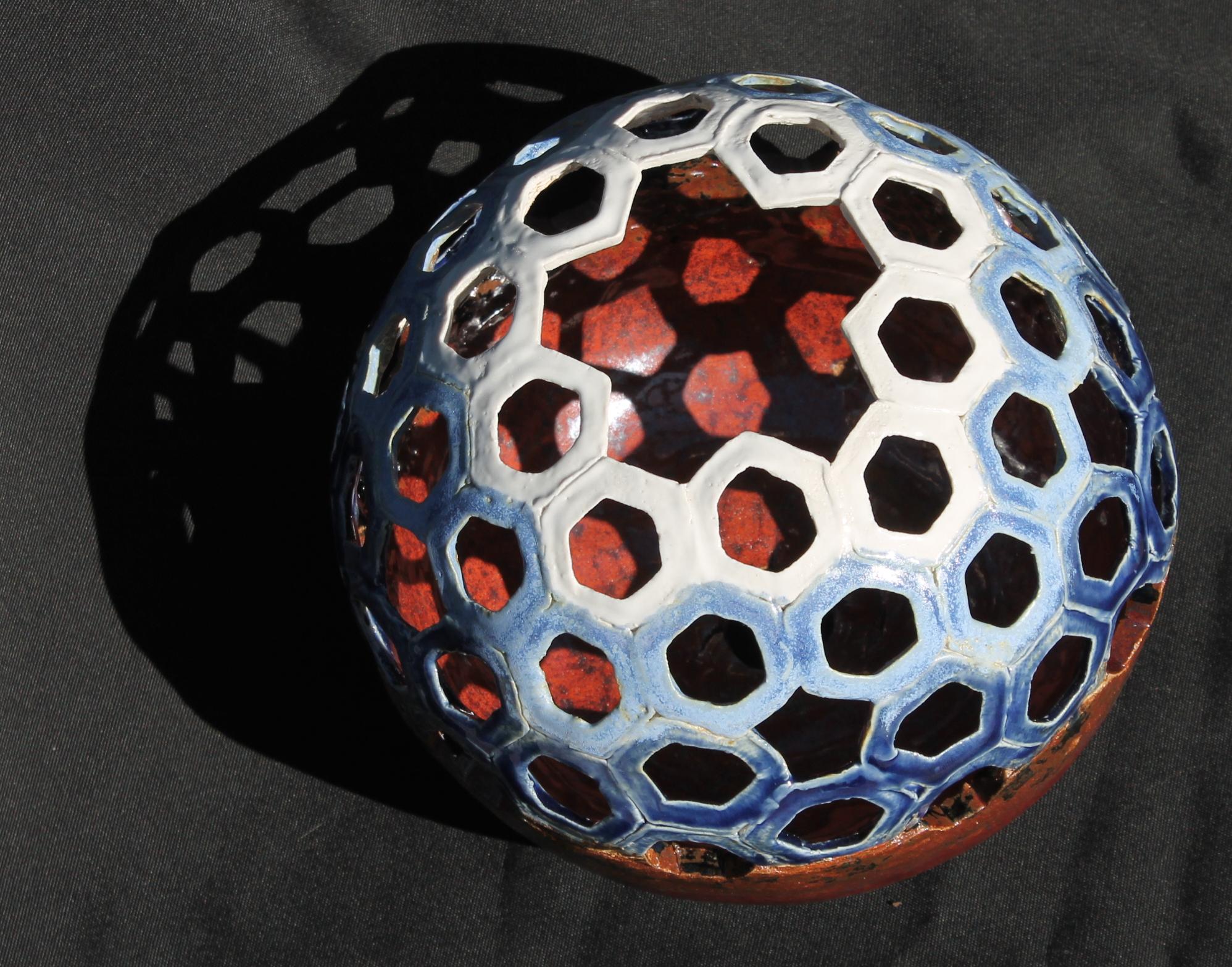 This is a Hex Geoid. The glaze is deep blue, brown and light tan accents. As a sculpture this geoid sits in a hexagonal base. See the Home Decor page for a Hex Geoid Lamp. |